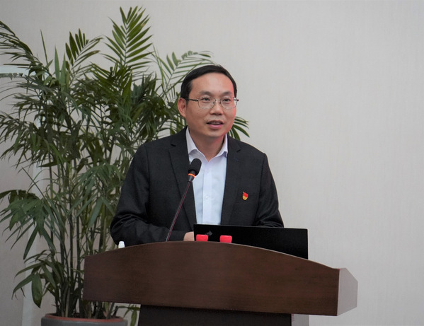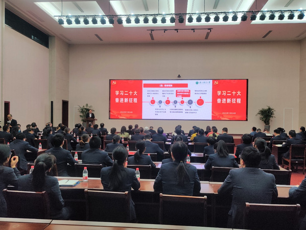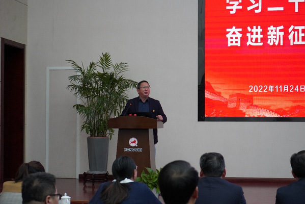 学院院长施俊天为校企双方员工讲授党课,宣讲党的二十大精神。施俊天从党的二十大概况、主要成果、精神核心要义等方面切入,对党的二十大精神进行深入解读。同时,他结合自己省第十五次党代会代表的身份,就深刻理解和准确把握省第十五次党代会的精神实质,以及大会的教育聚焦等内容进行了解读,为进一步理解党的二十大精神打好基础。他号召大家为全面建设社会主义现代化国家,全面推进中华民族伟大复兴而团结奋斗。