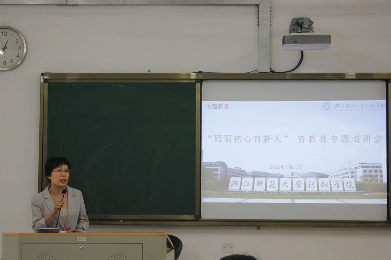 为进一步推动我院青年教师队伍建设改革,提升青年教师教学能力和业务水平,助力青年教师冲刺2023年浙江省第十三届青年教师教学竞赛,5月17日下午我院教师教学发展中心在2号楼107教室举办了“砥砺初心育新人”青教赛专题培训会。本次会议由教务部副主任徐燕主持,浙江省第十一届青年教师教学竞赛文科组特等奖获得者孙攀老师主讲,学院第十届青教赛参赛选手共同参加了此次培训。